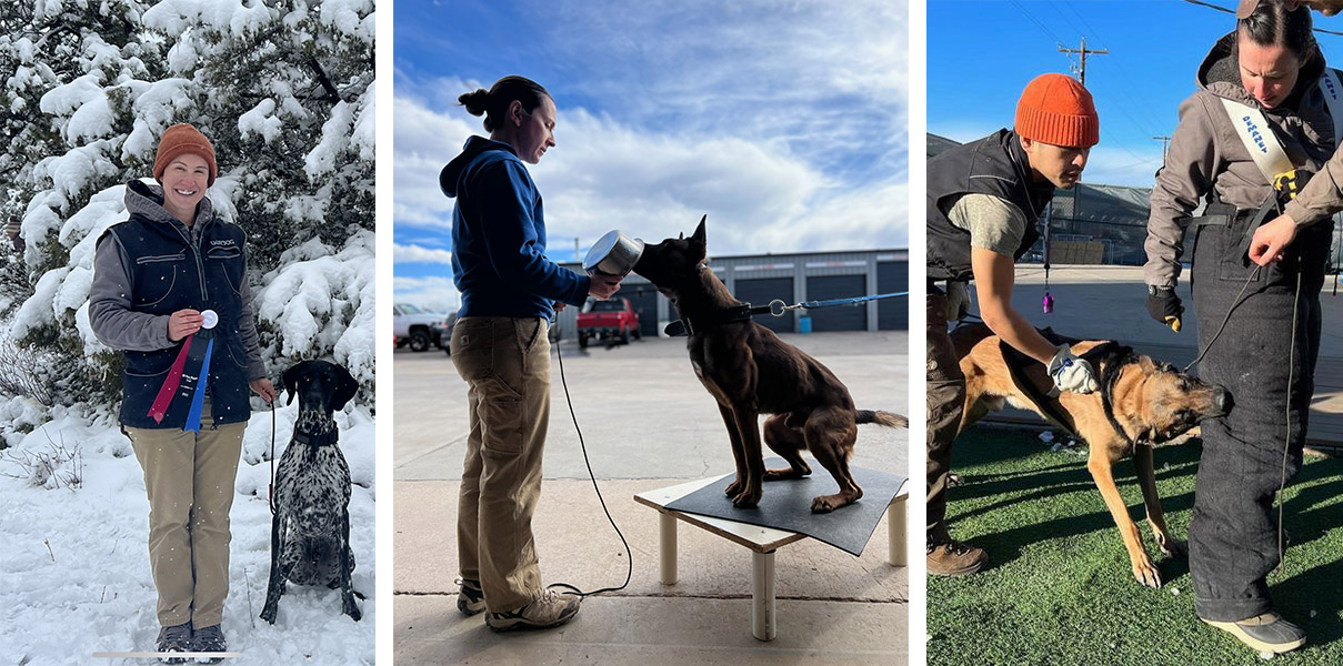 Working alongside her is Onyx, her German Shorthaired Pointer who has achieved multiple titles in Detection and Nose Work.